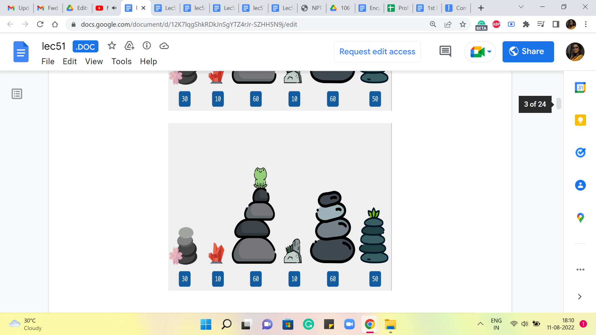 Now, there is a frog who is initially on stone one. So, introducing the frog. I should have probably picked up a side profile because the frog is going to jump around. So, this is not very realistic. But that is okay. I think it is nice to be able to see the smiling face of the frog as we try to solve this problem. So, that was the rationale.