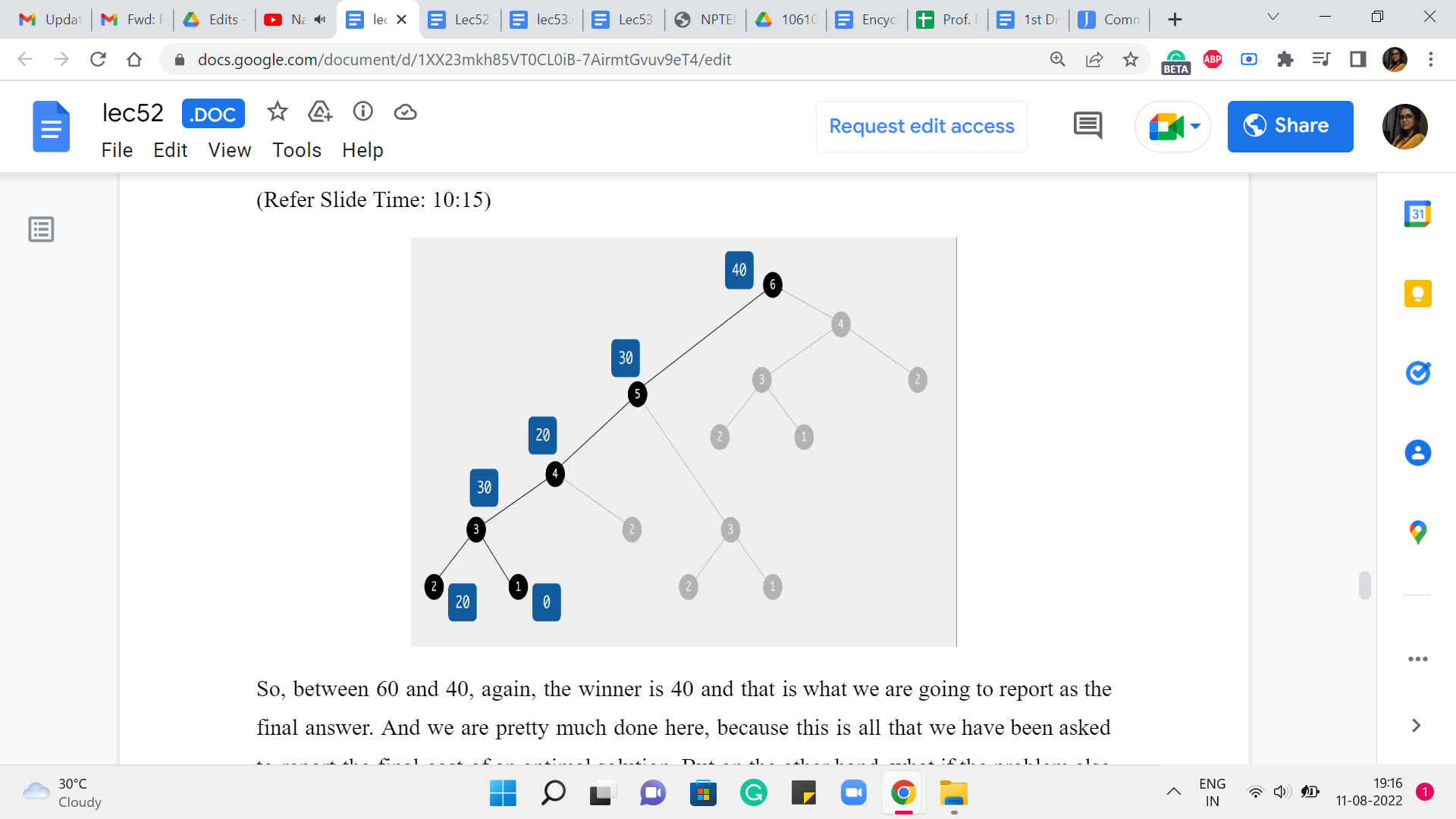 I should say that this is a common feature of dynamic programming-based approaches, which is that by doing just a little bit of extra work, in terms of tracking the choices that you are making as you go along, you will be able to output, not just the optimum value, but also an actual solution that witnesses that value. So, I think this is a good thing to practice and get used to. Some people call this running a backtrace on your DP, and essentially, it is something that is useful in the competitive programming context because you are often required to actually produce a solution.