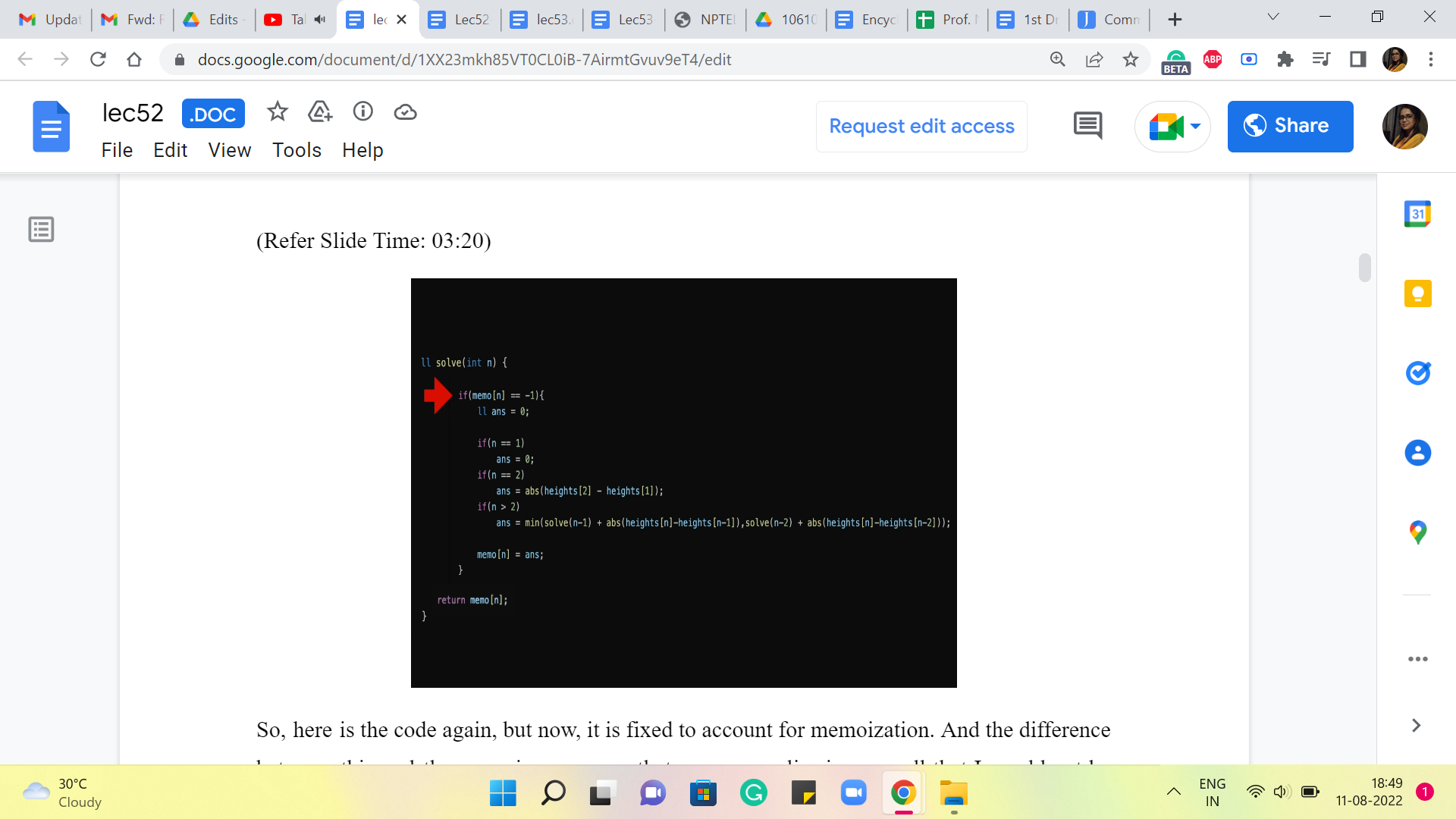 So, here is the code again, but now, it is fixed to account for memoization. And the difference between this and the recursive program that we saw earlier is so small that I would not be surprised if you did not even notice the difference from a quick glance. So, let me actually highlight the line that makes all the difference. It is this conditional statement here, which is basically saying, look, if you already know the answer, then you do not have to go through the process here. Okay. So, what we have done, behind the scenes in the sense that you do not see it on your screen right now, is we have initialized a memo array or a vector, where all the values by default are -1.