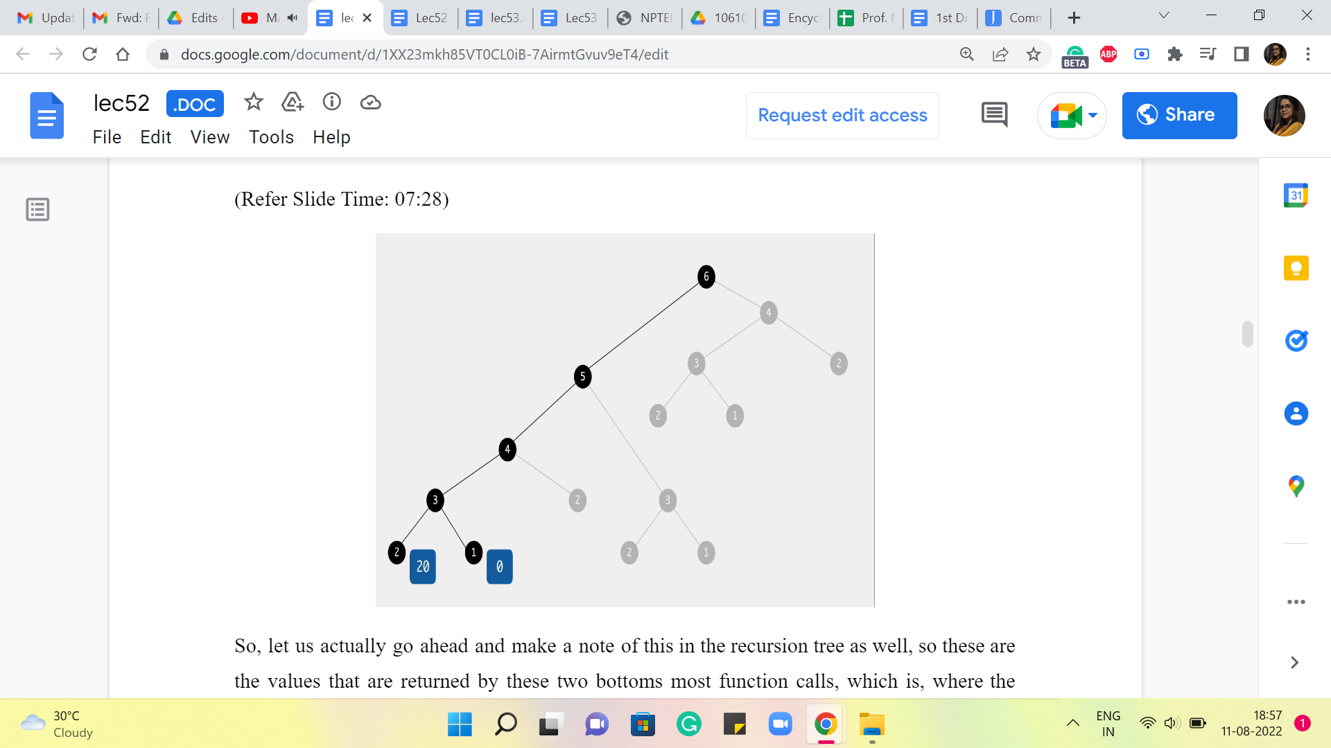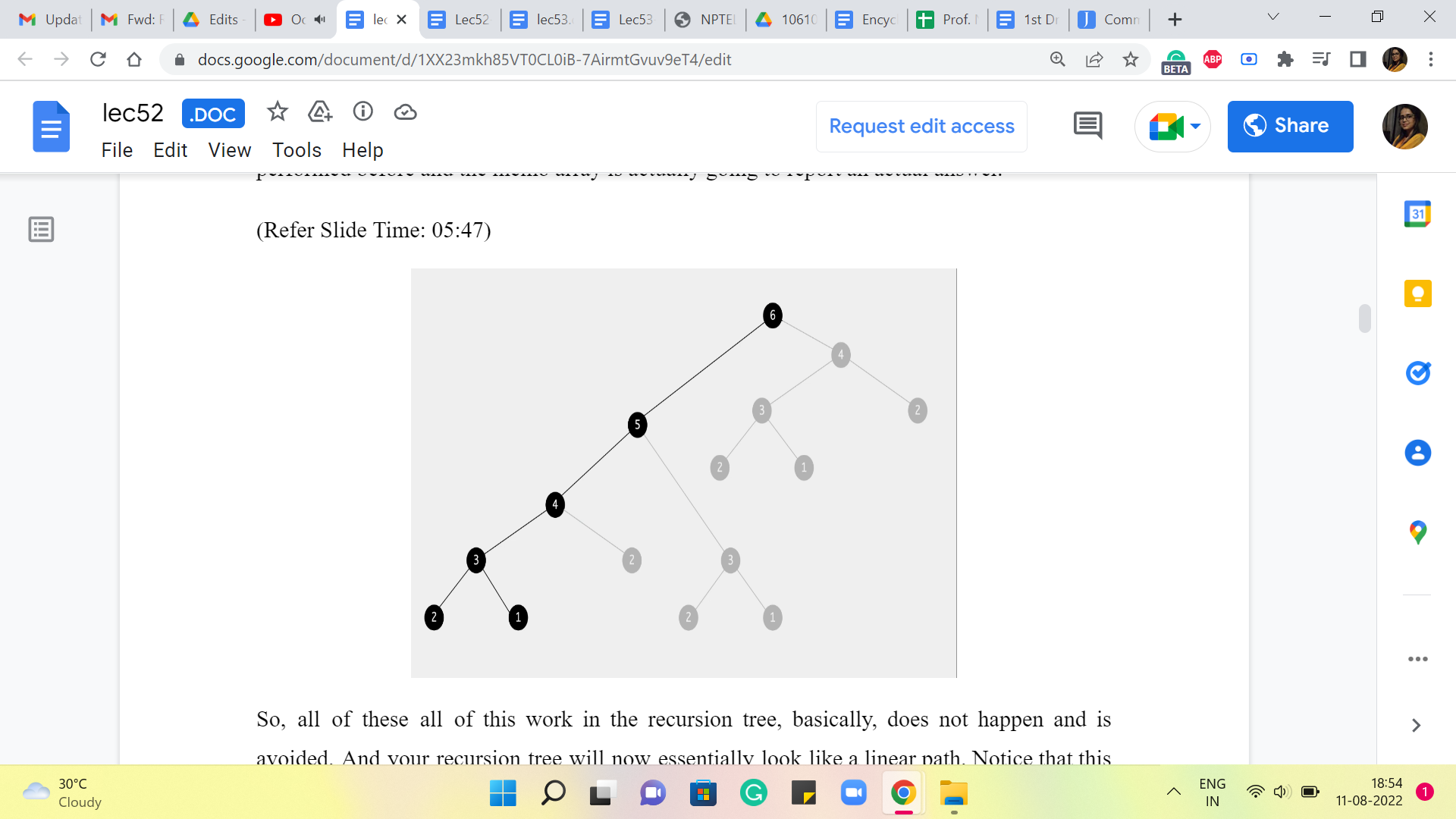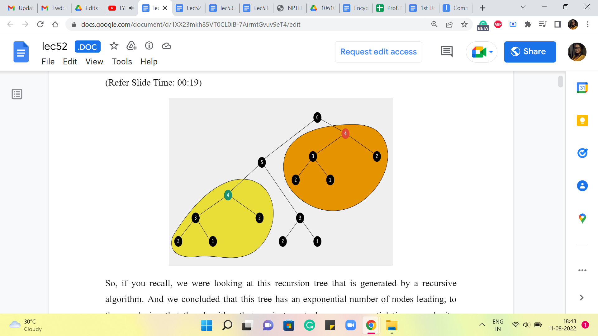 So, if you recall, we were looking at this recursion tree that is generated by a recursive algorithm. And we concluded that this tree has an exponential number of nodes, leading to the conclusion that the algorithm that we just wrote has an exponential time complexity because the time complexity is proportional to the number of function calls made. And that is what is depicted in this recursion tree. That is about as far as we got last time.