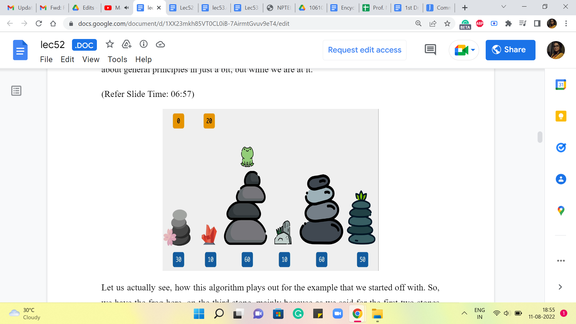 Let us actually see how this algorithm plays out for the example that we started off with. So, we have the frog here, on the third stone, mainly because as we said for the first two stones we already know what the costs are going to be. These are the base cases. So, in the first stone, let me just recap that the cost we agreed would be 0. And on the second stone, the cost would simply be the absolute differences, the absolute difference between the heights of the first and the second stone. And in this example, that happens to be 20.
