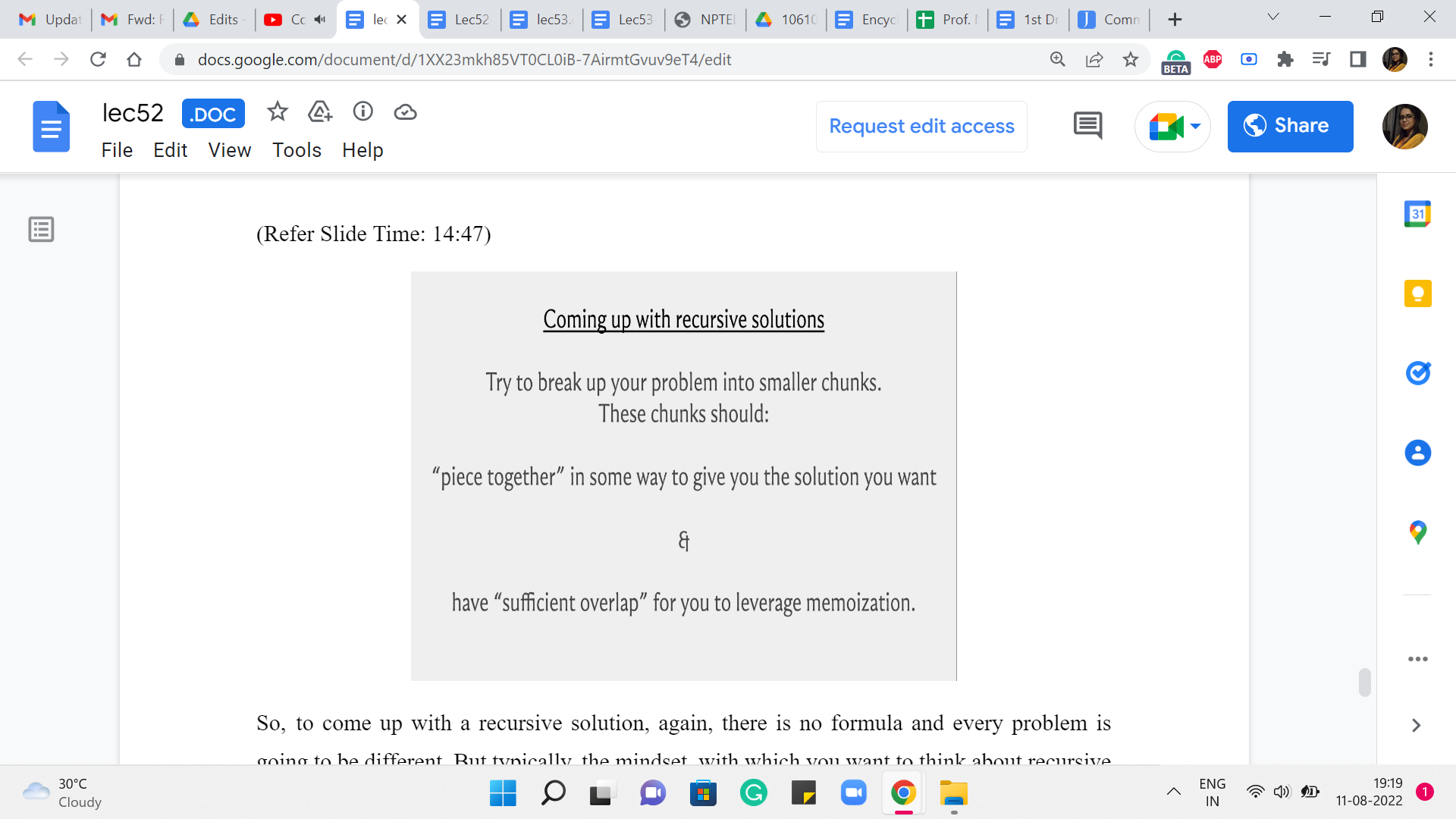 And whenever you come up with recursive solutions, do watch out for the potential to memoize. What you really want is a situation where there is a lot of redundant work, so that you can find ways of avoiding it and saving yourself some time. So, we will have more to say about general principles in just a bit, but while we are at it.
