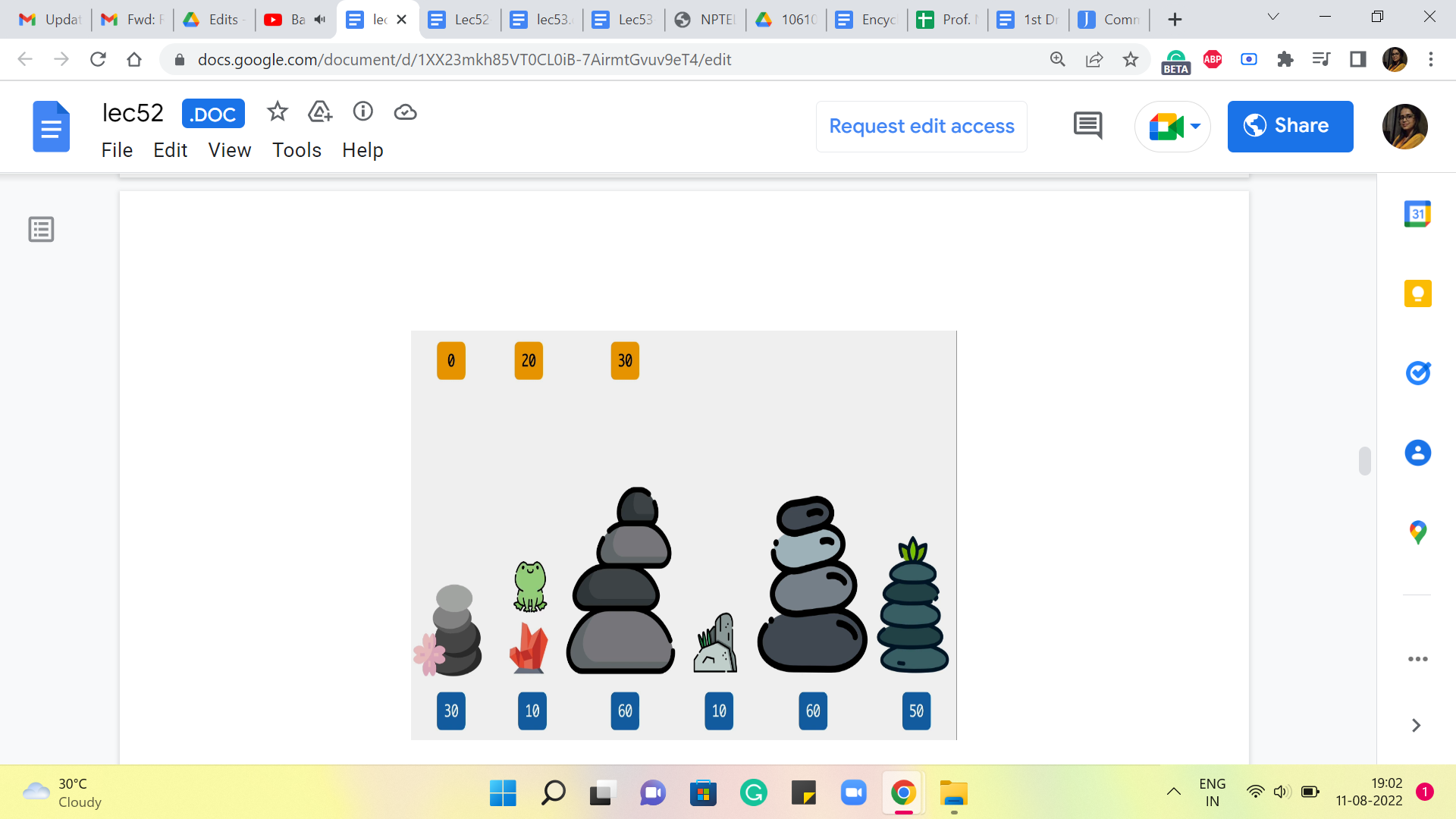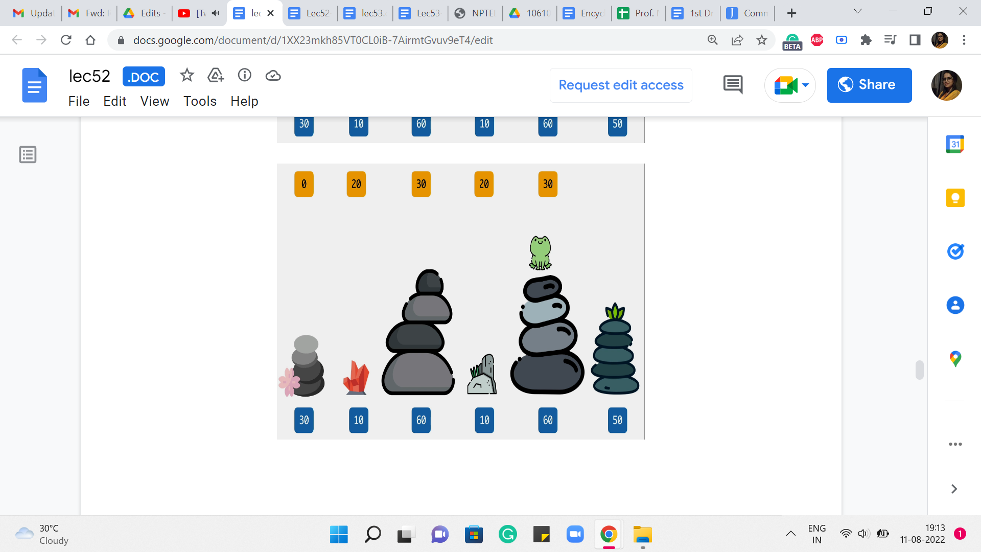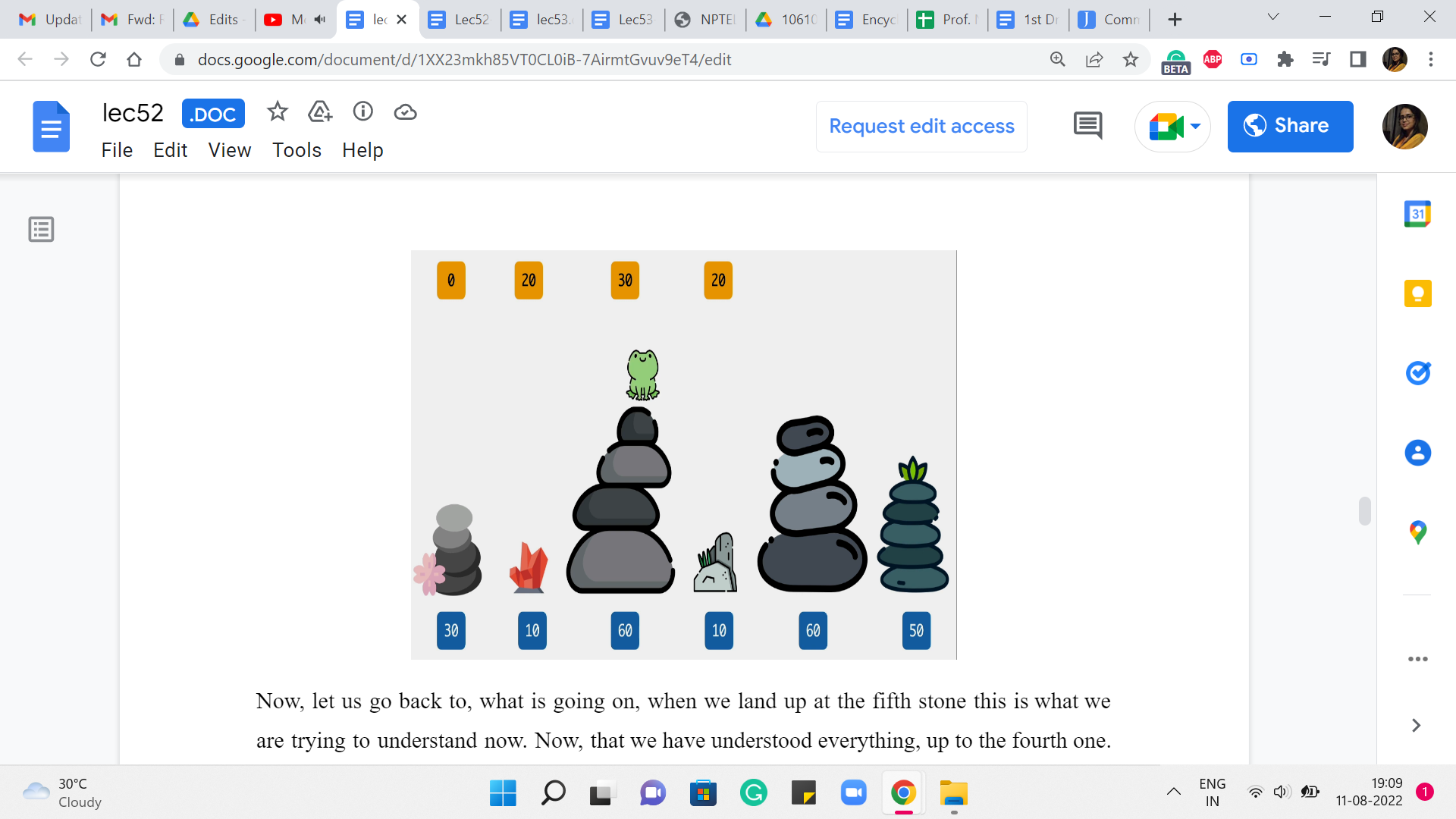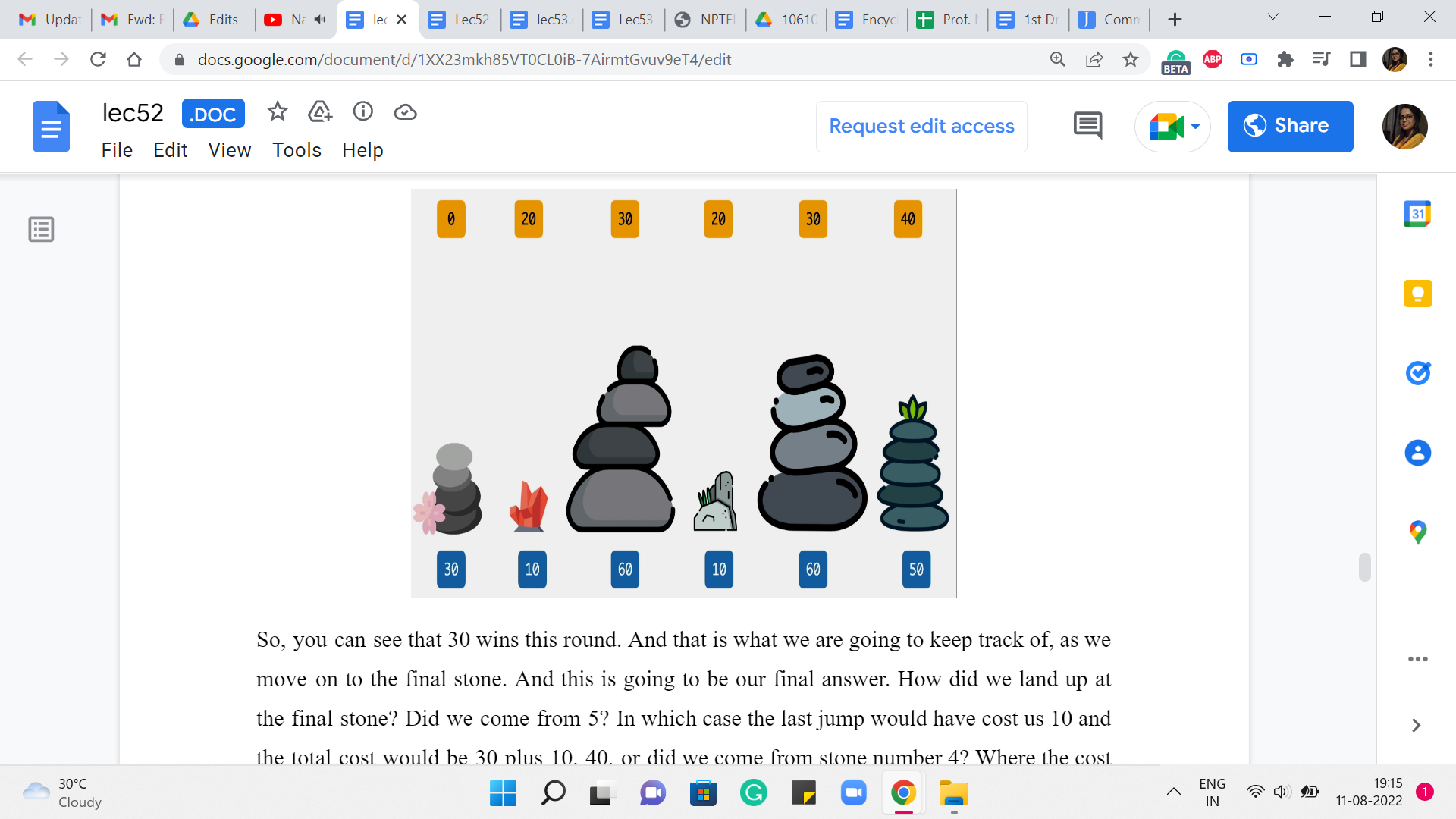 So, for instance, in the very last step, when we got to 40, we want to make sure we understand how we got to 40. So, the reason the answer was 40, was because we came in from stone number 5 with a cost of 10. And how did we get to stone number 5? Well, we got there from stone number 3 with a cost of 0. And how did we get to stone number 3? Well, we got there from stone number 1 with a cost of 30.