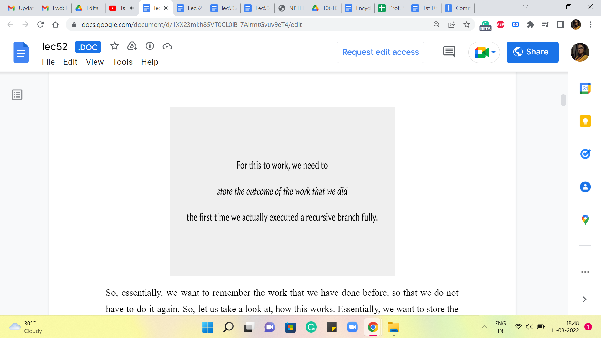 So, essentially, we want to remember the work that we have done before so that we do not have to do it again. So, let us take a look at how this works. Essentially, we want to store the outcomes of these prior function calls, so that at any point in time, whenever we have a recursive call, what we can do is really examine, if there is a need to go down the recursive rabbit hole prompted by this call.
