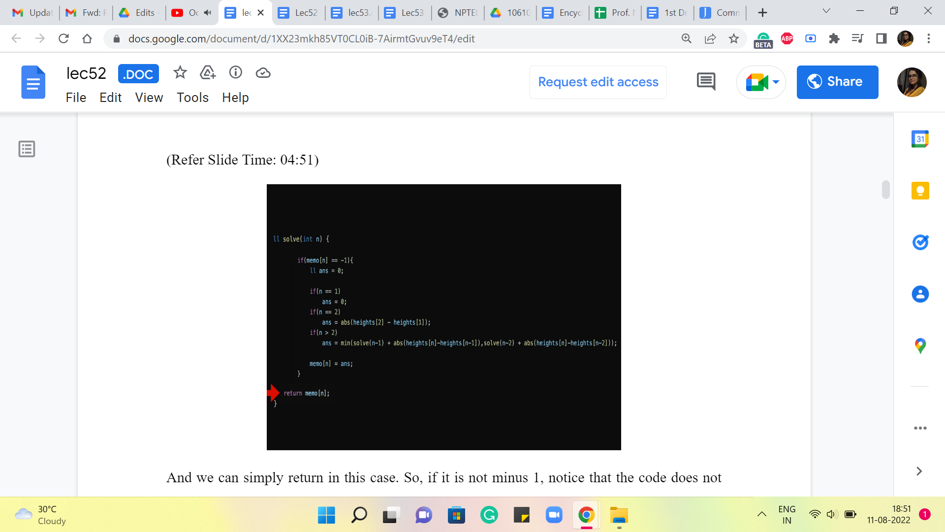 -1 in this problem is essentially a way of saying, we do not know the answer yet. If you are working with a problem, where the value -1 has some meaning or significance, then that is not a good value to initialize your array with. Basically, use some number, which has nothing to do with your problem, so that you can really use it as a code for saying I do not know yet. So, coming back to our program, here is what the code is doing for you. It is saying, okay, we want to know the answer for N. The first thing we do is check if we know this answer already. So, if the array value at N is something other than -1, that means, well, that is a déjà vu situation. We have already been here, we know, what the answer is.