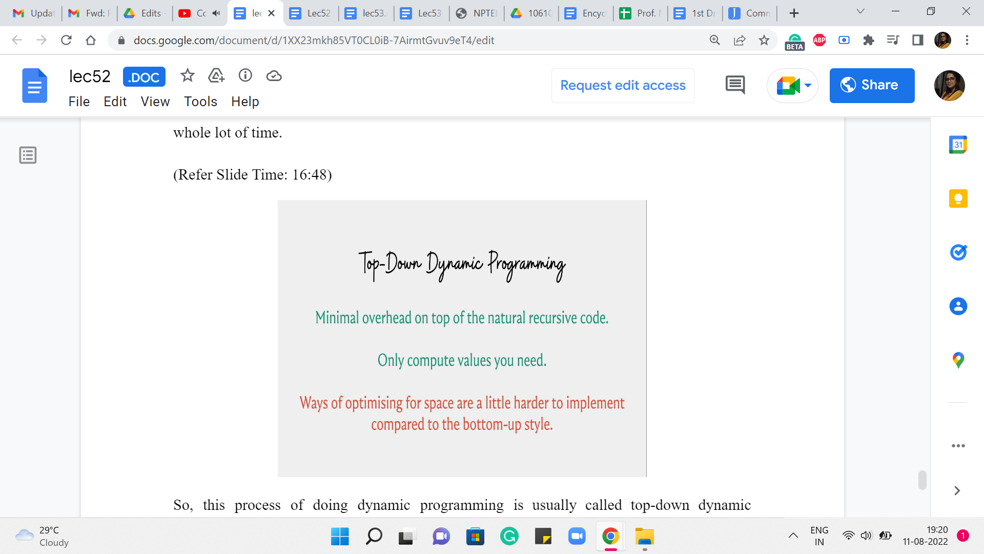 Although it is true that most people have sort of their preferred default styles when it comes to dynamic programming. And they would only switch if there was a specific need to switch from the point of view of a certain kind of optimization and so on. So, as I just said before, I think it is a good idea to at least be aware of both the styles and be reasonably comfortable implementing a given solution in either of these styles because that may be something that is useful in a specific situation.
