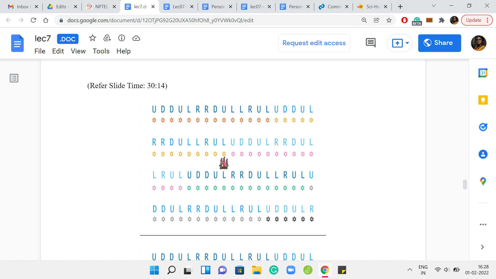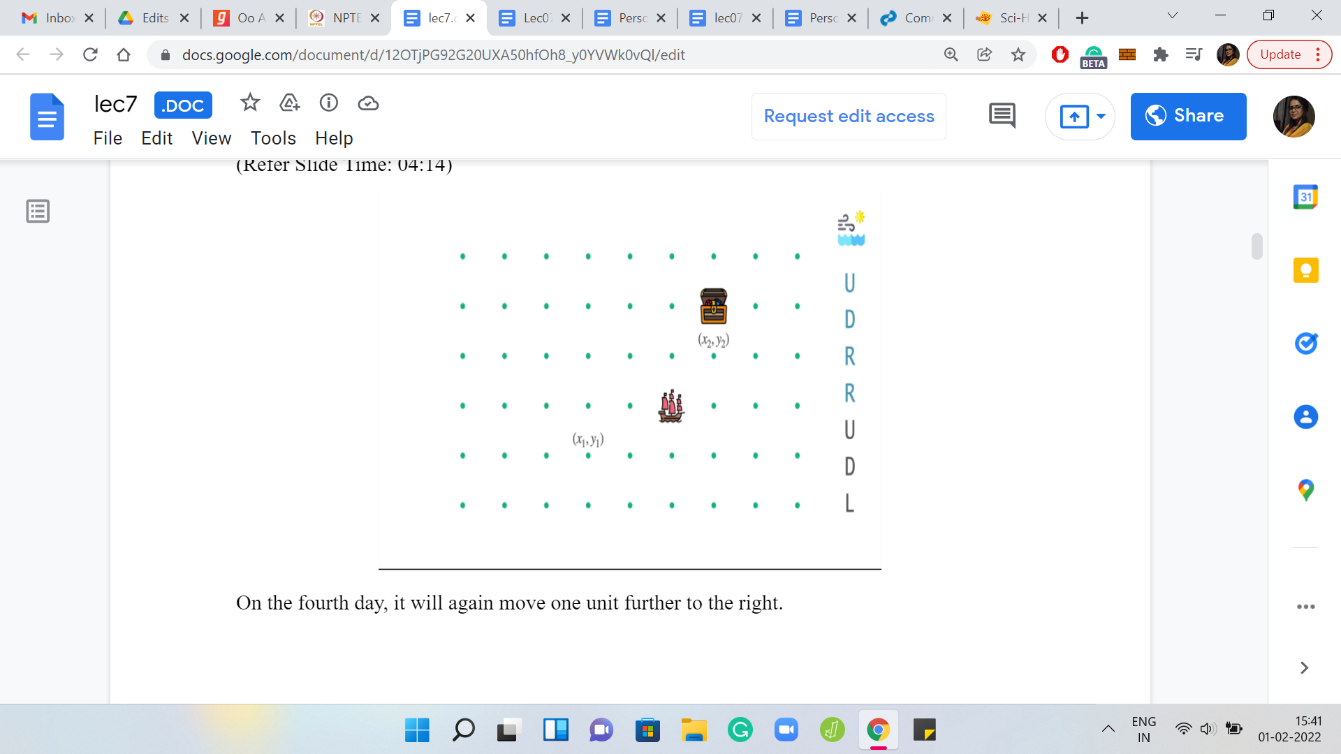 This is through a weather forecast. And the weather forecast is essentially coded in this language. It is a string, which has ‘n’ letters and each of these letters is one of these alphabets here. It is either ‘U, D, L, or R,’ signifying whether the wind is going to blow the ship in the east direction, or west or north or south. The winds also, in one day, will push the ship one unit in one of these directions. That is the behavior of the wind. Let us try to understand this through an example.